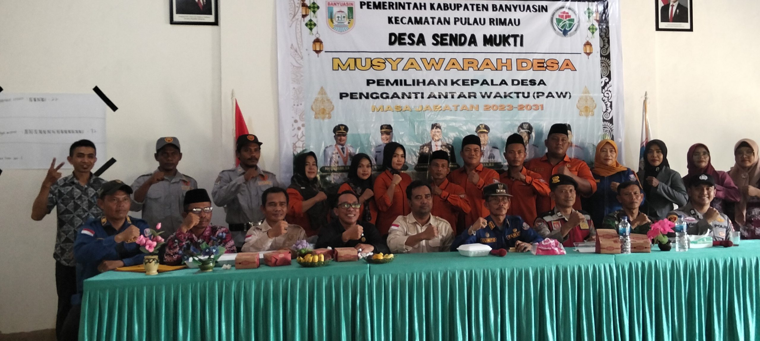 Kegiatan tersebut dimulai lebih kurang sekitar pukul 08.00 WIB di awali dengan pembacaan do’a, dilanjutkan dengan menyanyikan lagu Indonesia Raya, selanjutnya yakni Sambutan oleh Kecamatan Pulau rimau dan sambutan dari DPMD kabupaten Banyuasin Pembukaan, Musyawarah Desa Pemilihan Kepala Desa Pengganti Antar Waktu (PAW) Desa senda mukti di pimpin Oleh Ketua Badan Permusyawaratan Desa BPD, dan disepakati untuk dilakukan proses pemilihan melalui pemilihan suara terbanyak atau coblosan.