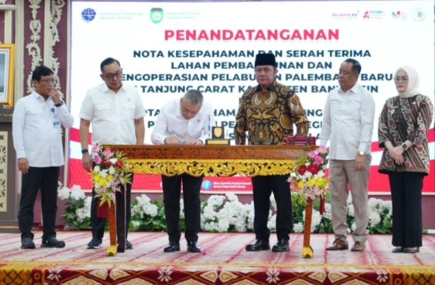 Palembang, si.com// Wakil Bupati Banyuasin, Netta Indian, S.P., mewakili Bupati Banyuasin menghadiri Penandatanganan Nota Kesepahaman dan Serah Terima Lahan Pembangunan dan Pengoperasian Pelabuhan Palembang Baru Di Tanjung Carat Kabupaten Banyuasin dan Nota Kesepahaman Penyelenggaraan Pelabuhan Pengumpan Regional Di Provinsi Sumatera Selatan, Jum’at (31/10/2025).
