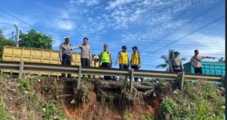 Dalam peninjauan tersebut, Kapolres dan jajaran melihat langsung kondisi longsor tanah, titik penurunan bahu jalan, serta potensi pergerakan tanah akibat intensitas hujan yang meningkat.