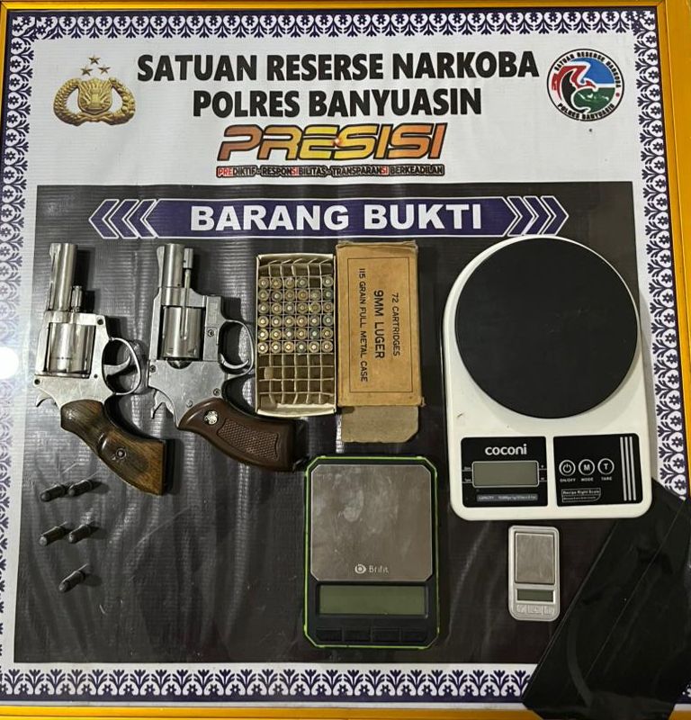 Di atas plafon rumah tersangka, petugas menemukan dua pucuk senjata api rakitan jenis revolver lengkap dengan 35 butir amunisi 9 mm, 5 butir amunisi 38 mm, yang disembunyikan bersama narkotika.