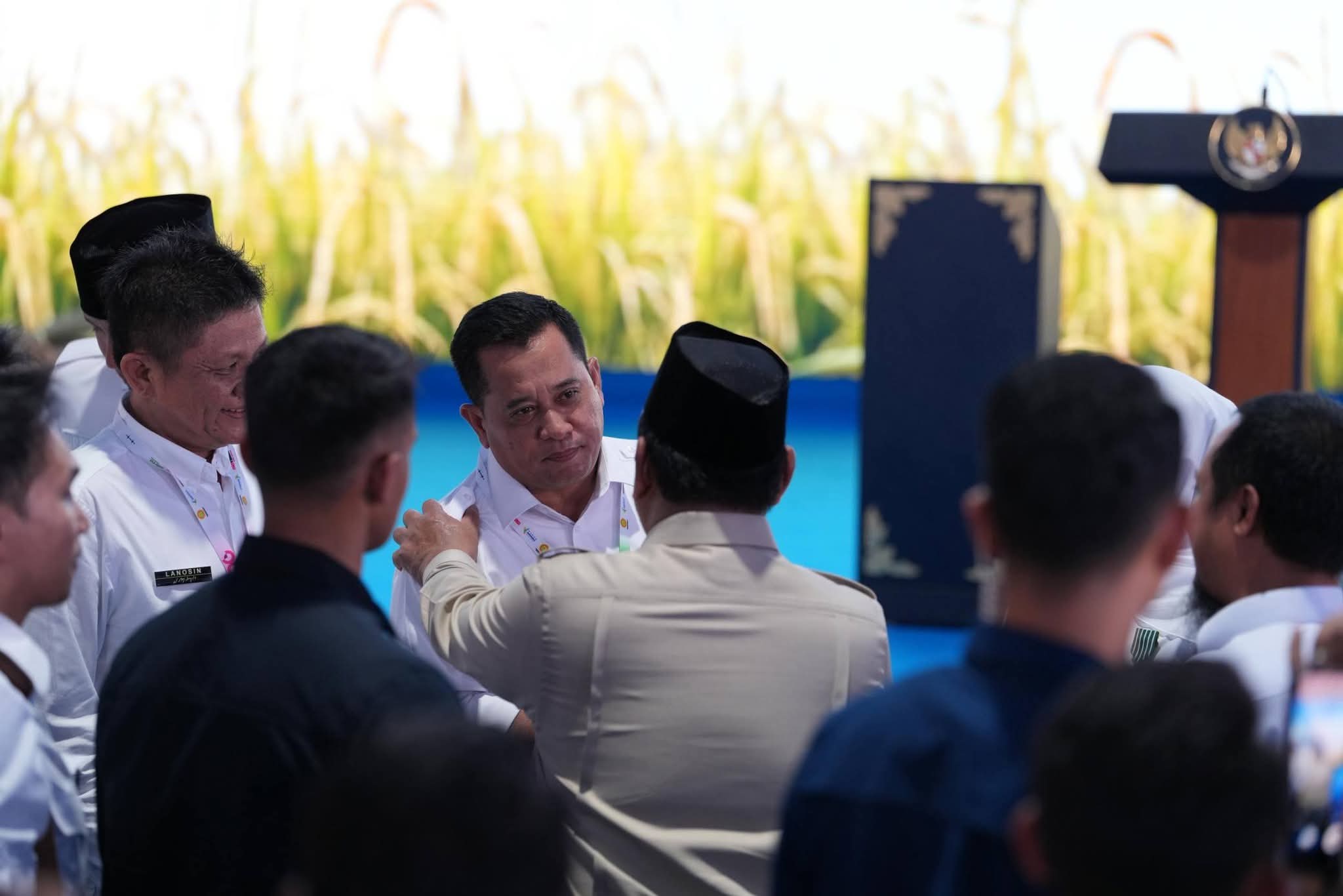 Pada kesempatan tersebut, Presiden Prabowo didampingi Menteri Sekretaris Negara Prasetyo Hadi, Menteri Koordinator Bidang Pangan Zulkifli Hasan, Menteri Kelautan dan Perikanan Sakti Wahyu Trenggono, Wakil Menteri Pertanian Sudaryono, serta Sekretaris Kabinet Letkol Teddy Indra Wijaya.