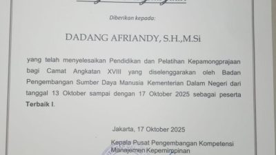 Jakarta – Prestasi membanggakan kembali ditorehkan oleh Kabupaten Penukal Abab Lematang Ilir (PALI). Salah satu putra terbaik daerah ini, Dadang Afriandy, S.H., M.Si, yang menjabat sebagai Camat Tanah Abang, berhasil meraih Predikat Terbaik I se-Indonesia pada Pendidikan dan Pelatihan Kepamongprajaan bagi Camat Angkatan XVIII Tahun 2025, yang diselenggarakan oleh Badan Pengembangan Sumber Daya Manusia (BPSDM) Kementerian Dalam Negeri Republik Indonesia.