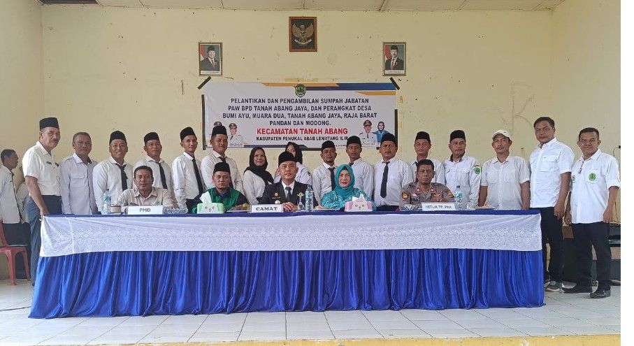 PALI – Pemerintah Kecamatan Tanah Abang, Kabupaten Penukal Abab Lematang Ilir (PALI), menggelar pelantikan dan pengambilan sumpah jabatan bagi sejumlah pejabat Pergantian Antar Waktu (PAW) Badan Permusyawaratan Desa (BPD) serta perangkat desa dari enam desa di wilayah tersebut, pada Rabu pagi (5/11/2025), bertempat di aula kantor kecamatan.