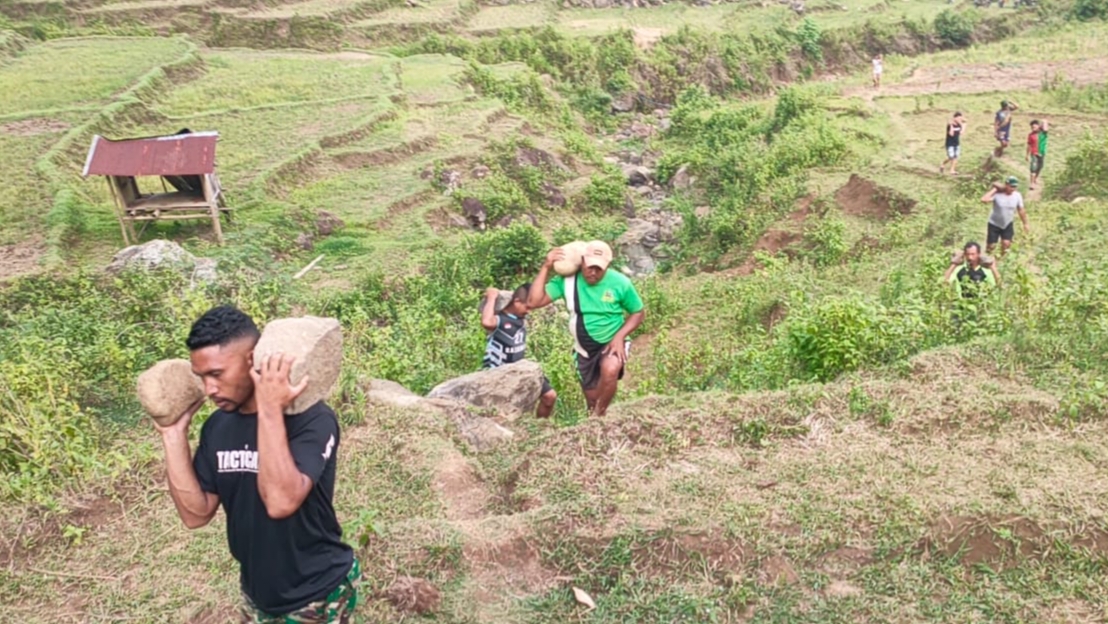 Ruteng, NTT//SI.com- Dalam semangat kebersamaan dan kemanunggalan TNI bersama rakyat, anggota Kodim 1612/Manggarai bersama masyarakat Desa Pinggang, Kecamatan Cibal, melaksanakan kegiatan gotong royong mengangkut material batu untuk pembangunan saluran irigasi, Senin (27/10/2025).