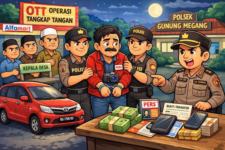 Muara Enim — Aparat kepolisian melakukan operasi tangkap tangan (OTT) terhadap seorang oknum yang mengaku sebagai wartawan dan diduga melakukan pemerasan terhadap sejumlah kepala desa di Kecamatan Benakat, Kabupaten Muara Enim, Sabtu (21/2/2026).