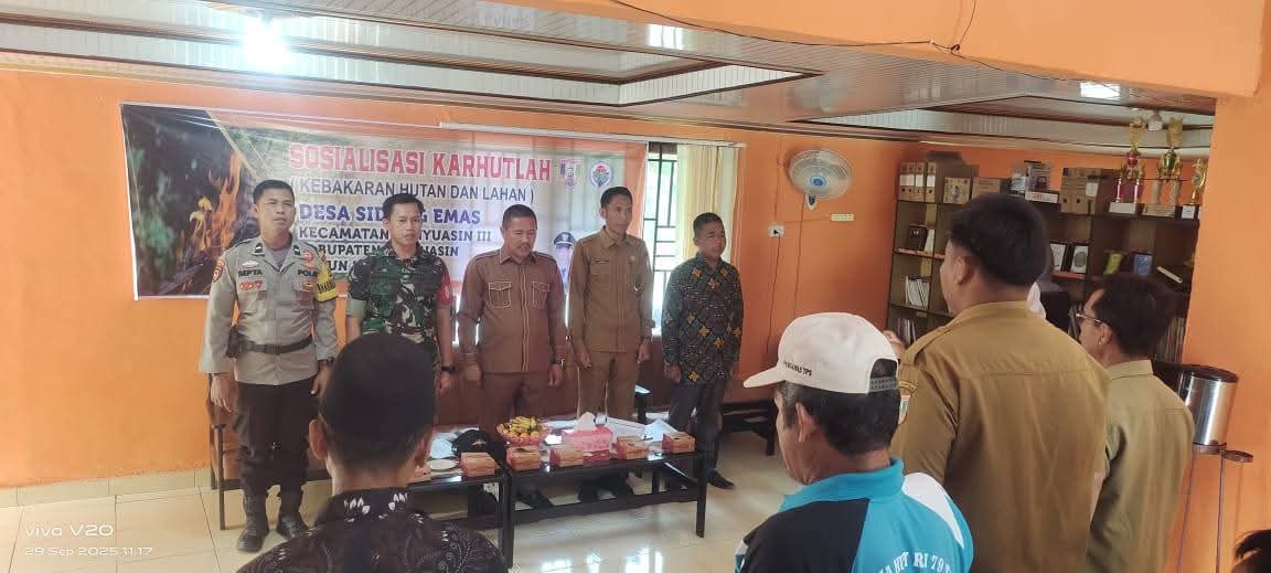 Banyuasin, si.com// sosialisasi karhutla kebakaran hutan dan lahan bersama pemerintah desa kecamatan, sosialisasi karhutla bertempat di kantor desa sidang mas kecamatan Banyuasin lll kabupaten Banyuasin Sumatera Selatan, sosialisasi tersebut membahas pentingnya menjaga hutan dan lahan,(29/9/2025)