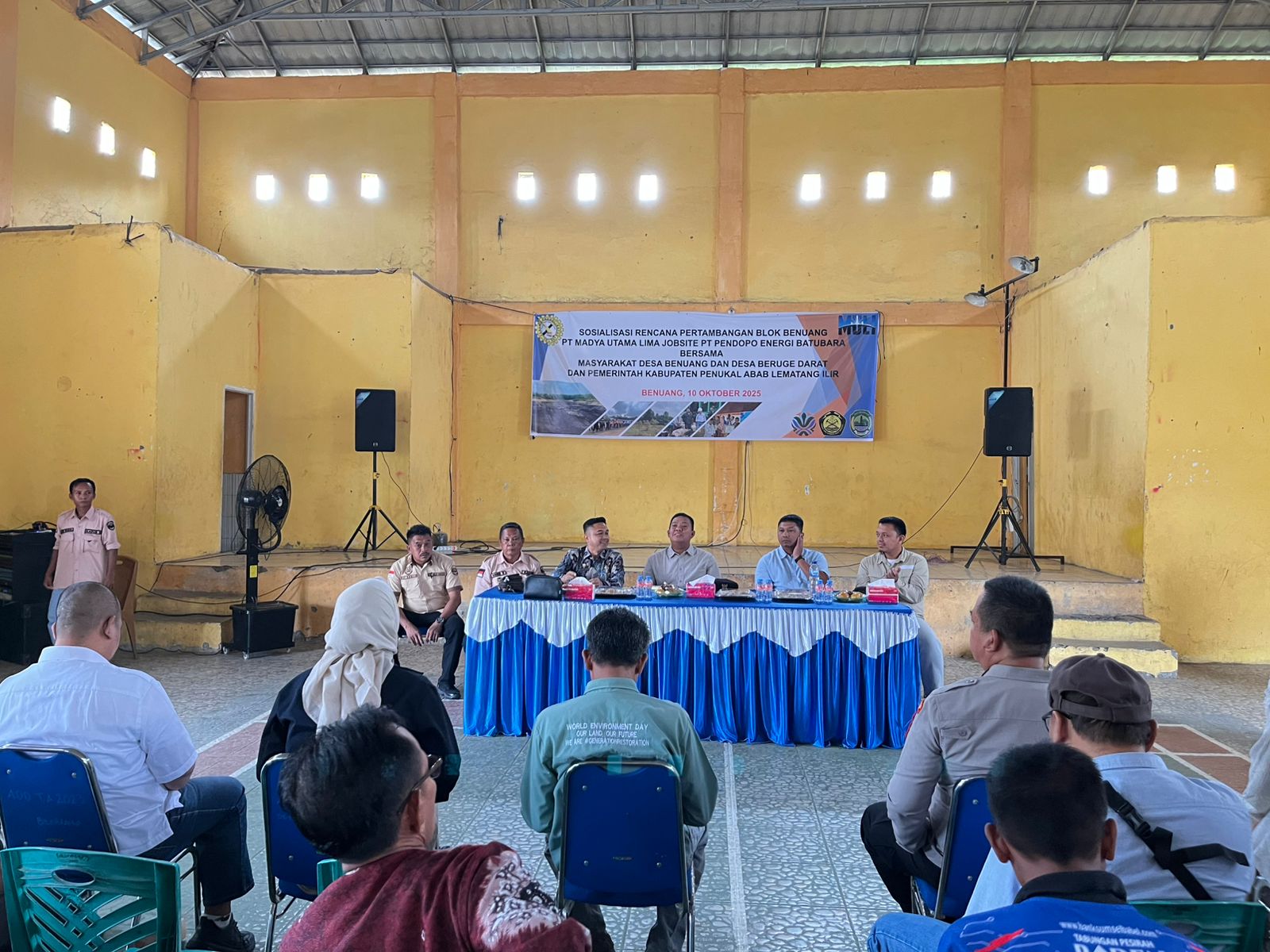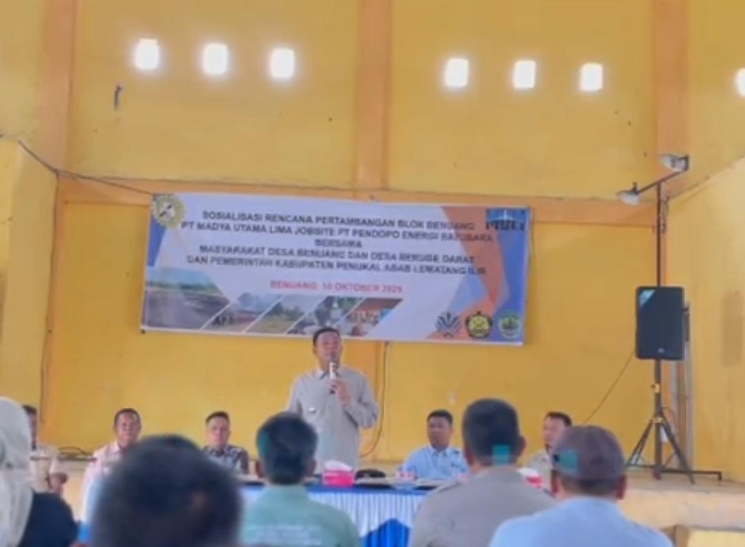 Talang Ubi, PALI – Pemerintah Kabupaten Penukal Abab Lematang Ilir (PALI) kembali menunjukkan peran aktif dan keberpihakannya terhadap masyarakat. Hal ini tampak dalam kegiatan Sosialisasi Rencana Pertambangan Blok Benuang oleh PT Madya Utama Lima (Jobsite PT Pendopo Energi Batubara) yang berlangsung di Gedung Serbaguna Desa Benuang, Kecamatan Talang Ubi, Kabupaten PALI, Jumat (10/10/2025).