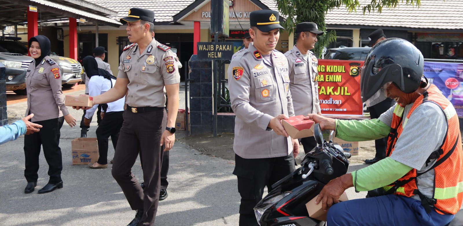 Muara Enim Sumatera Selatan — Dalam rangka menyemarakkan bulan suci Ramadhan 1447 H, jajaran Polsek Lawang Kidul melaksanakan kegiatan sosial berupa pembagian takjil kepada masyarakat, Senin (23/2/2026) sore. Kegiatan yang berlangsung sekitar pukul 15.30 WIB tersebut digelar di depan Mako Polsek Lawang Kidul dan disambut antusias oleh para pengguna jalan yang melintas.