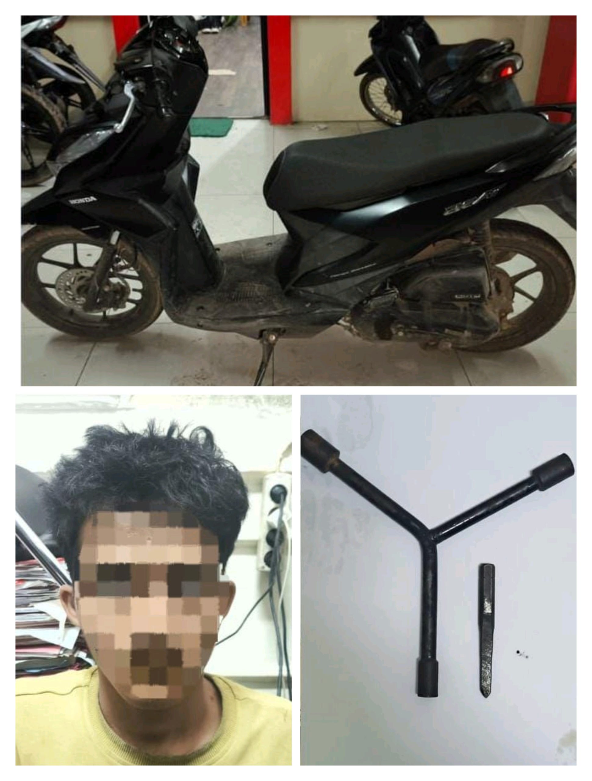 Dari tangan pelaku, polisi menyita barang bukti berupa 1 unit sepeda motor Honda Beat yang dicuri, 1 buah kunci roda, dan 1 buah besi lurus berujung pipih atau biasa disebut “kunci T” yang diduga digunakan untuk membobol kunci motor.