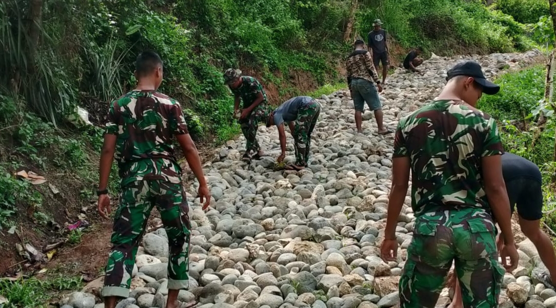 Ruteng, NTT//SI.com- Kodim 1612/Manggarai terus menggenjot pengerjaan fisik dalam program TNI Manunggal Membangun Desa (TMMD) ke-126, yang kali ini menyasar Desa Rado, Kecamatan Cibal, Kabupaten Manggarai. Salah satu fokus kegiatan yakni penyusunan batu atau telford sepanjang 480 meter, yang dilaksanakan secara gotong royong antara personel TNI dan warga setempat.